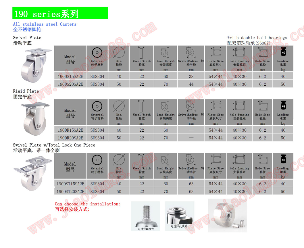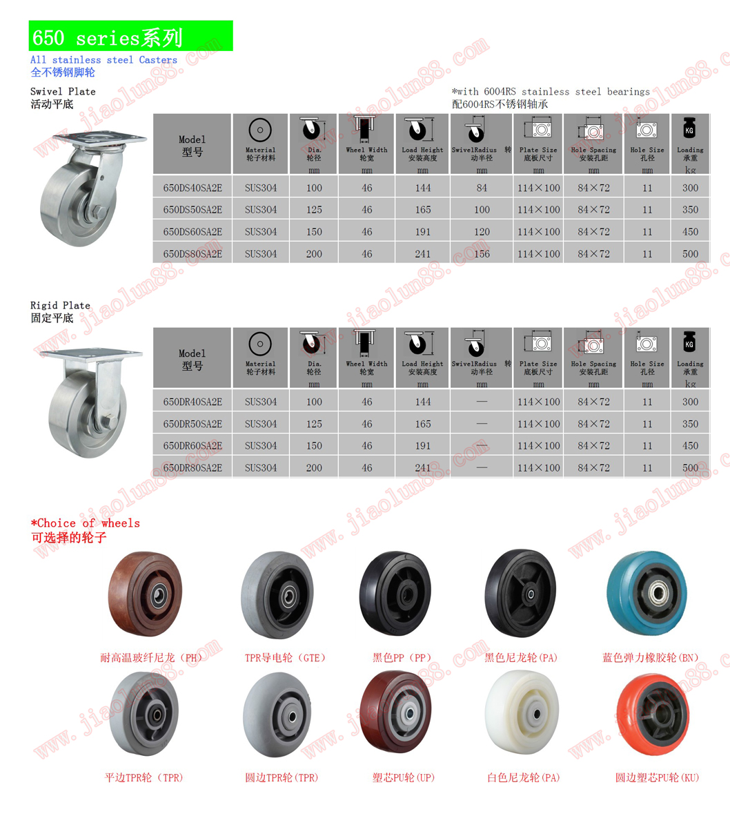 ◆輪子選配:全SUS304不銹鋼輪、尼龍、聚氨酯(PU)、超級人造膠(TPR)、耐高溫輪、全聚氨酯輪、導(dǎo)電輪、防靜電輪等。