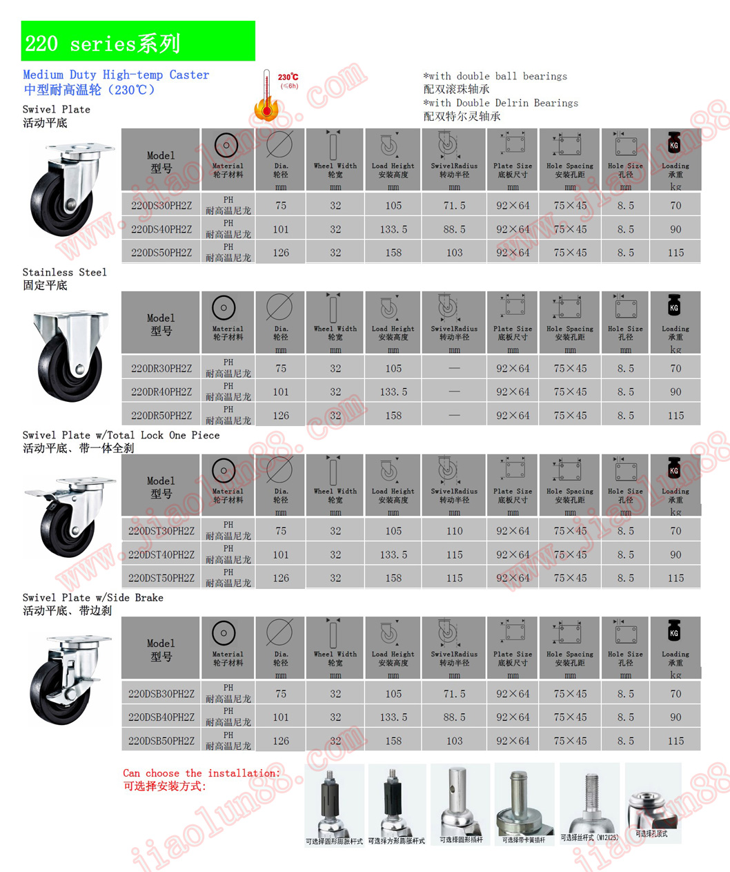 中型耐高溫/耐低溫腳輪參數(shù)特點(diǎn):(耐高溫230度)