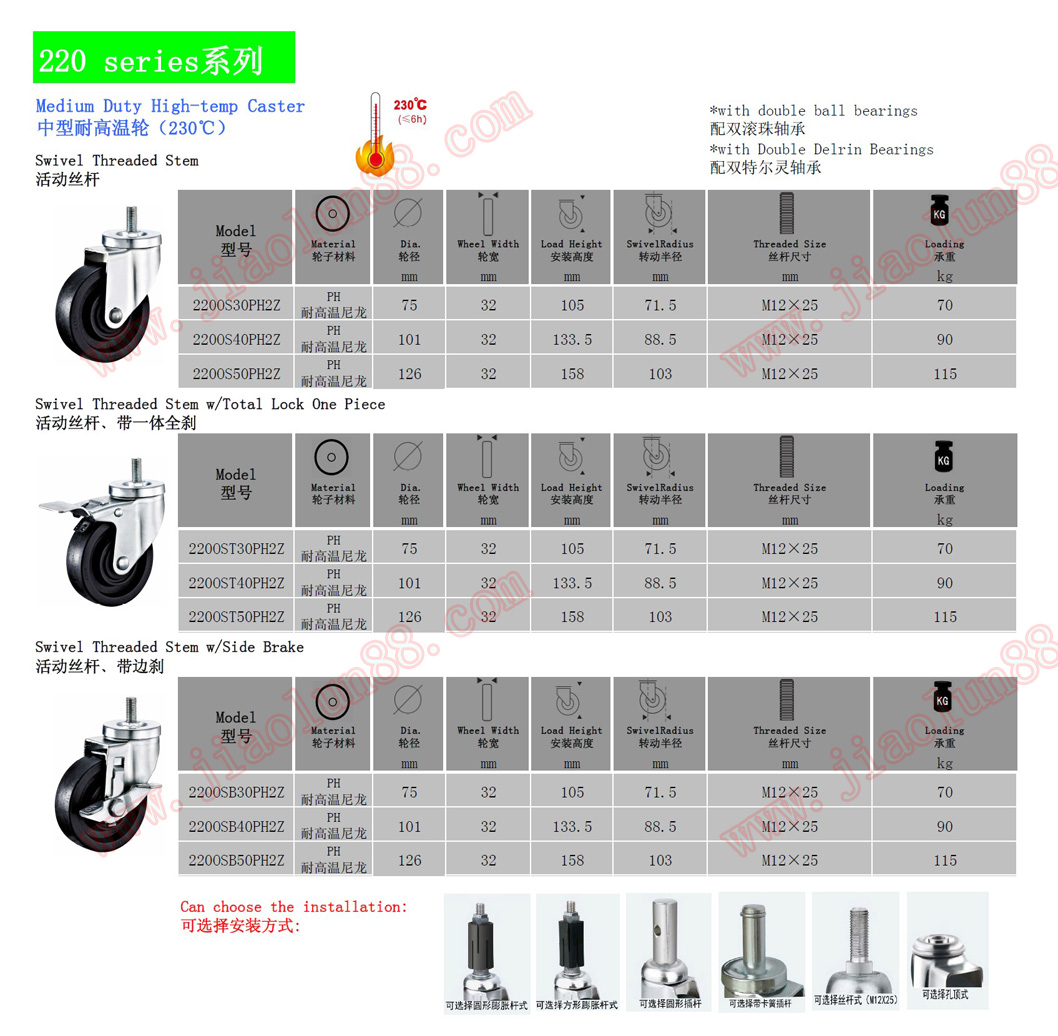 中型耐高溫/耐低溫腳輪參數(shù)特點(diǎn):(耐高溫230度)