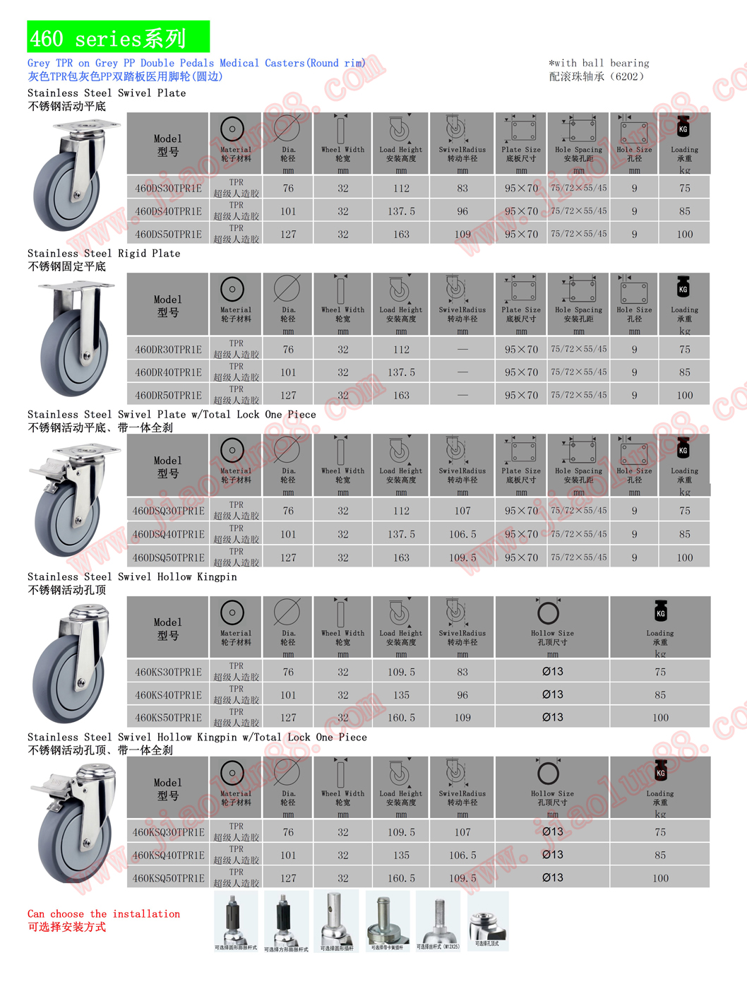 ◆ 輪子選配:全不銹鋼、尼龍、聚氨酯(PU)、超級人造膠(TPR)、耐高溫耐低溫、導(dǎo)電防靜電等。
