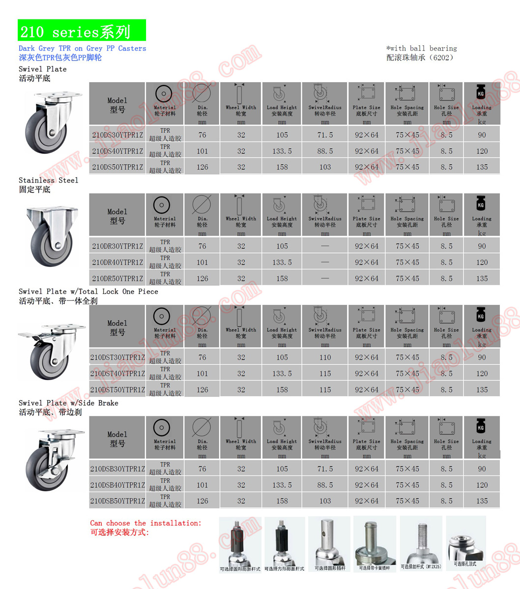 ◆ 輪子直徑:¢75mm(3寸)、¢90mm(3.5寸)、¢100mm(4寸)、¢125mm(5寸)。