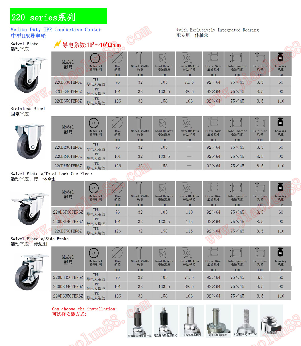 導(dǎo)電腳輪參數(shù)特點(diǎn):(導(dǎo)電系數(shù)10的3次方-10的5次方歐姆)