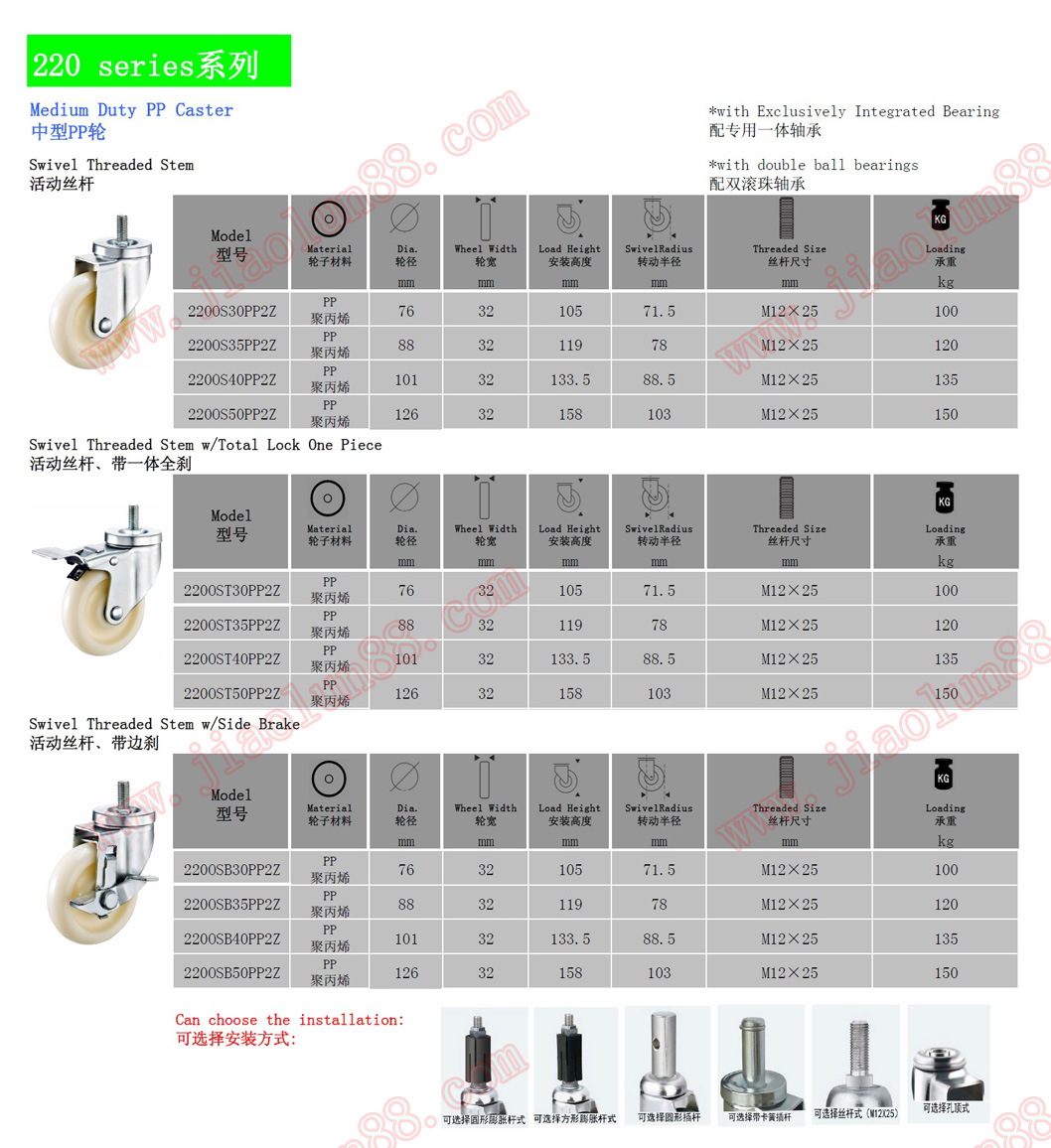 ◆ 產(chǎn)品規(guī)格:萬向、固定、絲桿、萬向帶雙剎(同時(shí)鎖住支架和輪子)、孔頂、插桿、膨脹式。