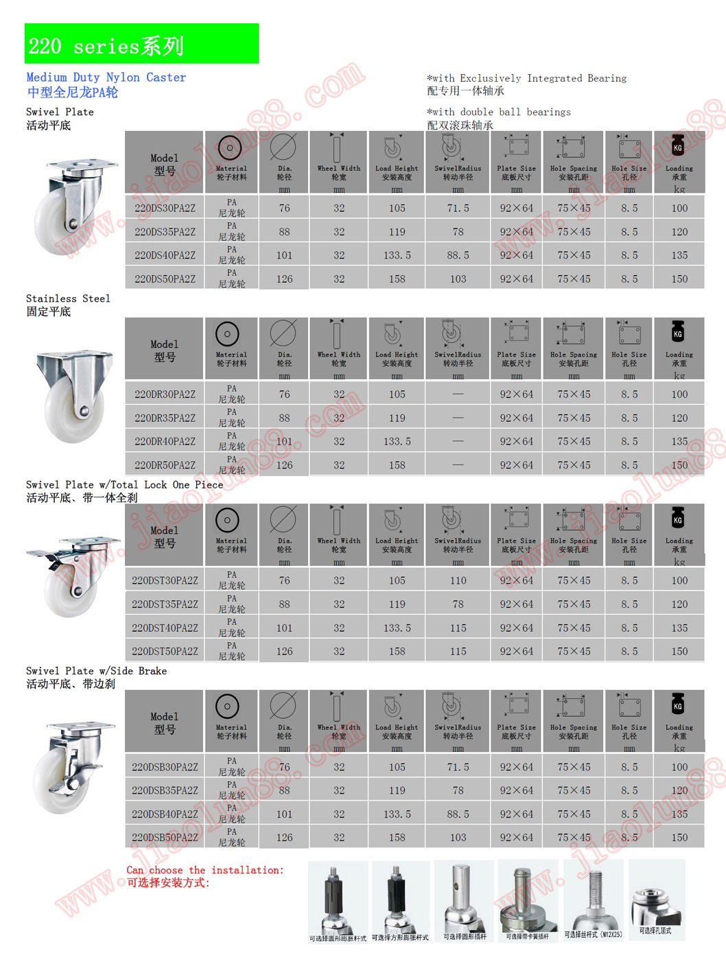 ◆ 輪子直徑:¢75mm(3寸)、¢90mm(3.5寸)、¢100mm(4寸)、¢125mm(5寸)。
