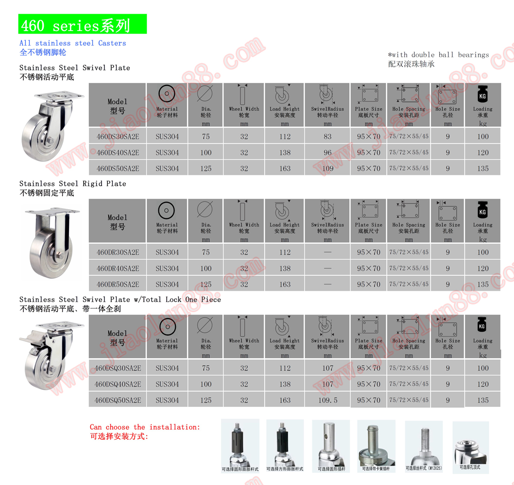 中型304不銹鋼腳輪參數(shù)特點:(單輪最大承載135公斤)