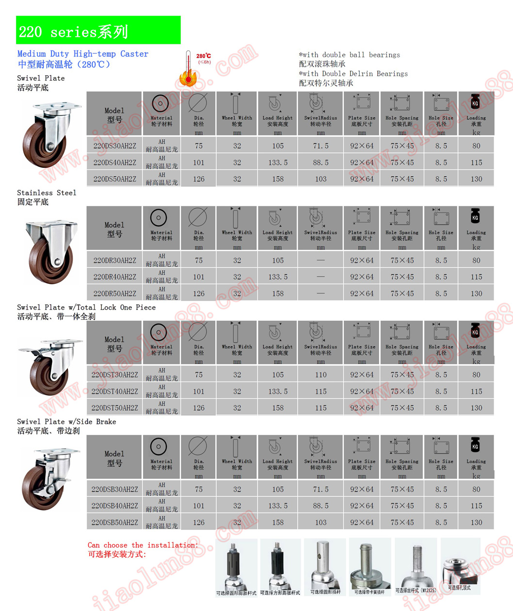 中型耐高溫/耐低溫腳輪參數(shù)特點:(耐高溫280度)