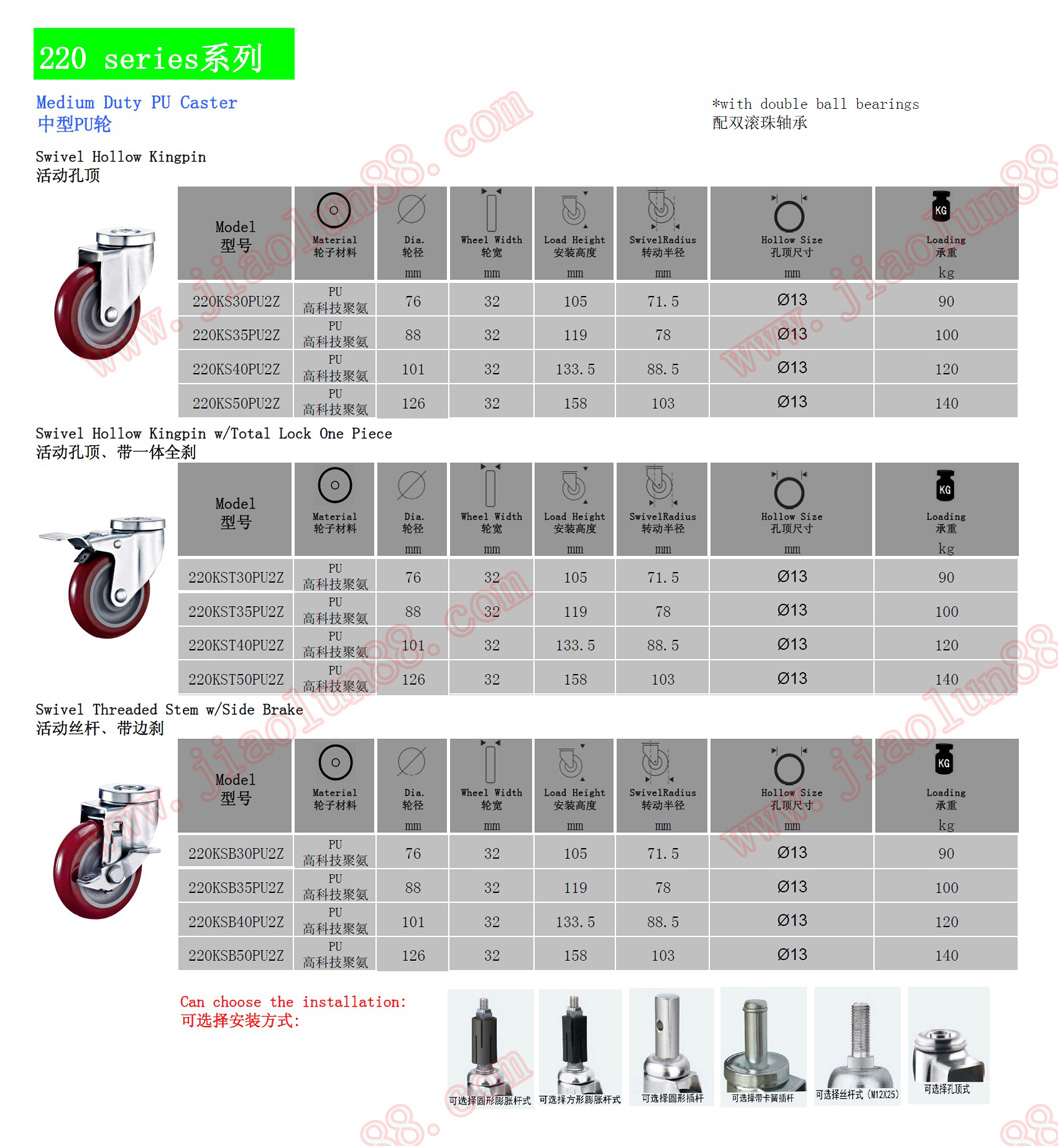 ◆ 產(chǎn)品規(guī)格:萬向、固定、絲桿、萬向帶雙剎(同時鎖住支架和輪子)、孔頂、插桿、膨脹式。