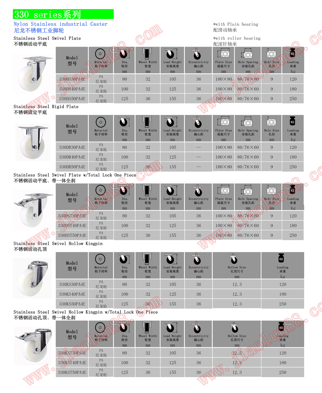 ◆ 輪子選配:全不銹鋼、尼龍、聚氨酯(PU)、超級人造膠(TPR)、耐高溫耐低溫、導(dǎo)電防靜電等。